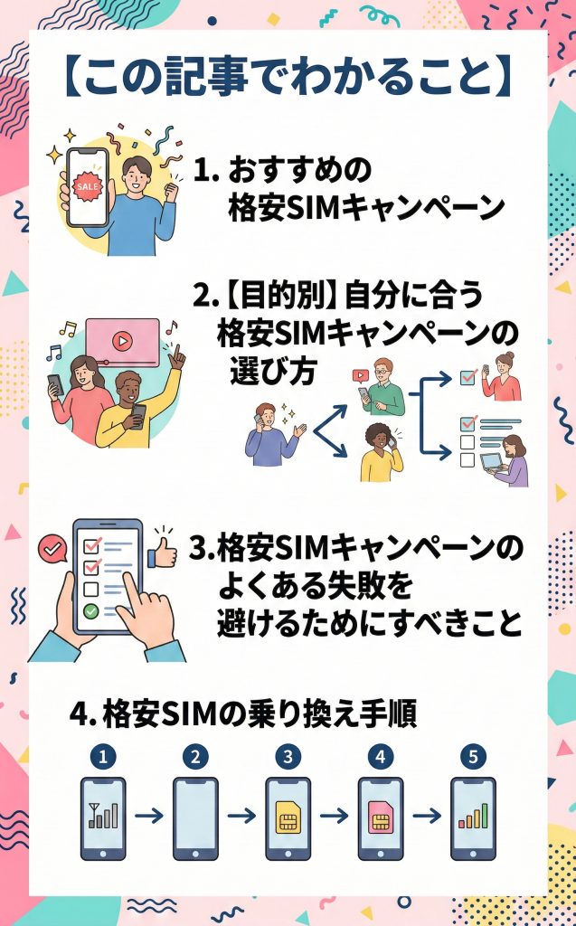 格安SIMのキャンペーンは種類が多くて複雑に見えるかもしれませんが、大きく分けると5つのタイプだけに整理できます。