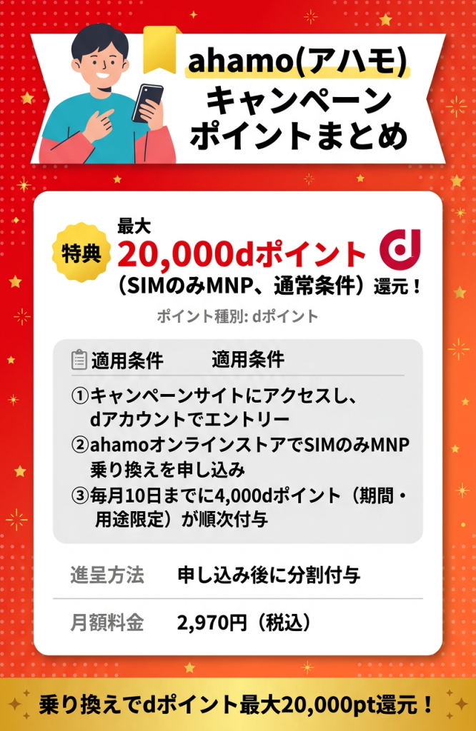 - ahamo|乗り換えでdポイント最大2万ポイント還元ほか