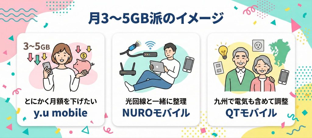 | 主要プラン月額 | 2,277円〜(トクトクプラン2・割引適用時) | 3,058円〜(シンプル3 S・税込) | 990円〜(ベストプラン・3GBまで) |