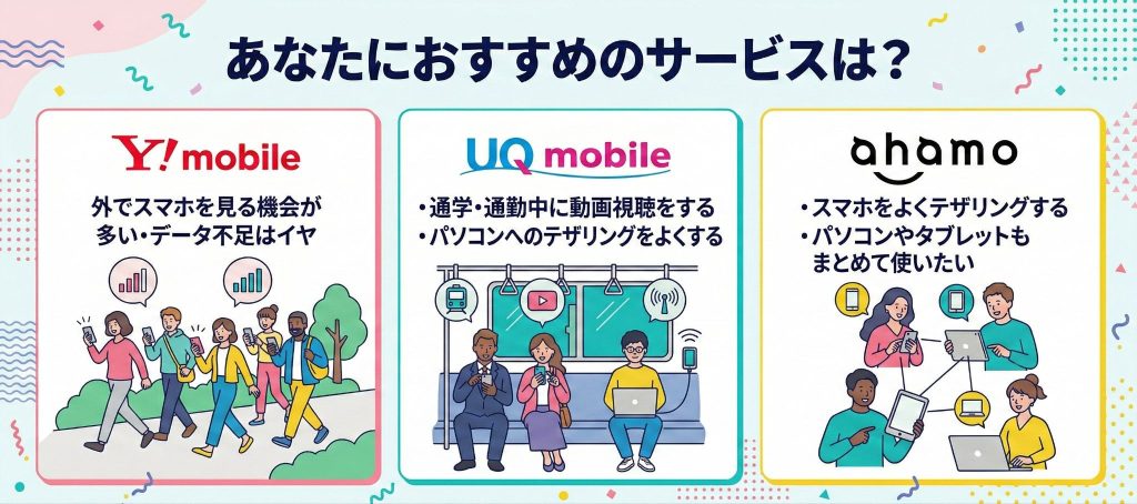 | 比較項目 | ワイモバイル | UQモバイル | ahamo |