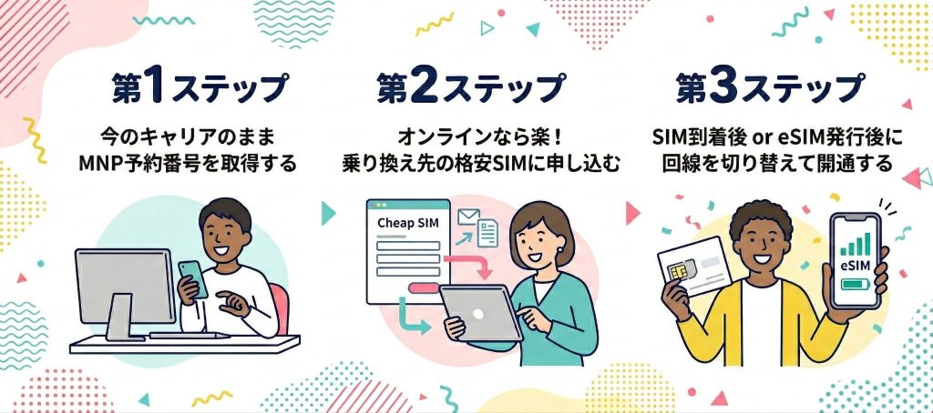 格安SIMは、MNP予約〜申し込み〜開通の3ステップで簡単に乗り換えできます。