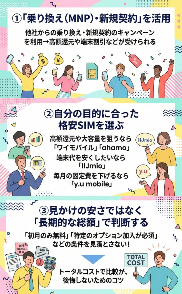 新しく格安SIMを申し込むなら、今の携帯会社のままプランを変えるよりも、他社への「乗り換え」や「新規契約」のキャンペーンを利用した方がお得になる場合があります。