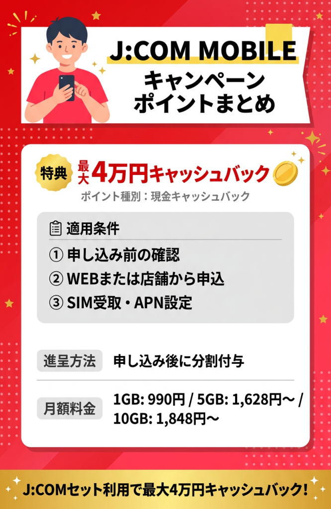 - J:COMモバイル|他サービスとセット利用で、最大総額4万円分キャッシュバック