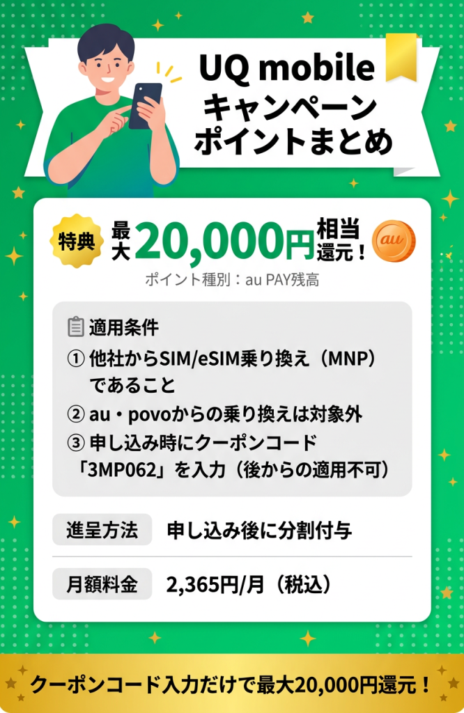 UQモバイルは、申し込み時にクーポンコードを入力するだけでau PAY残高 最大20,000円相当が還元されるお得な乗り換えキャンペーンを実施中です。