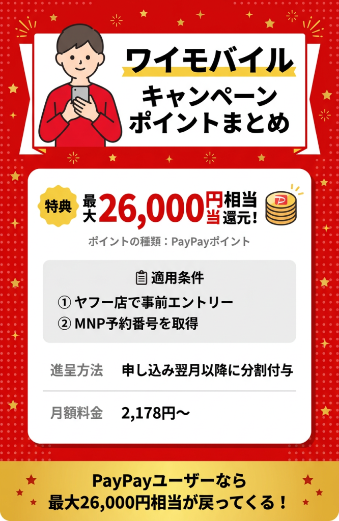 ワイモバイル(Y!mobile)は、他社からの乗り換えでPayPayポイント最大26,000円相当が受け取れる業界トップクラスの高額還元キャンペーンを実施中です。