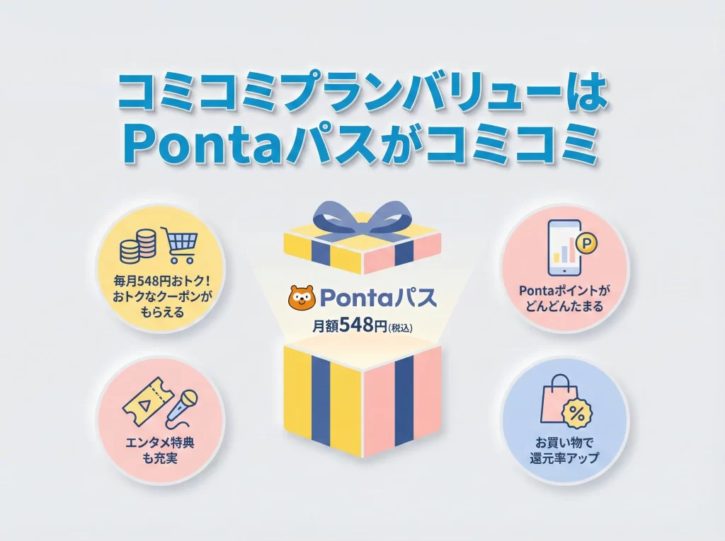 コミコミプランバリューは、割引は効かない代わりに「10分かけ放題+Pontaパス込み」で月額3,828円(税込)が固定のわかりやすいプランです。