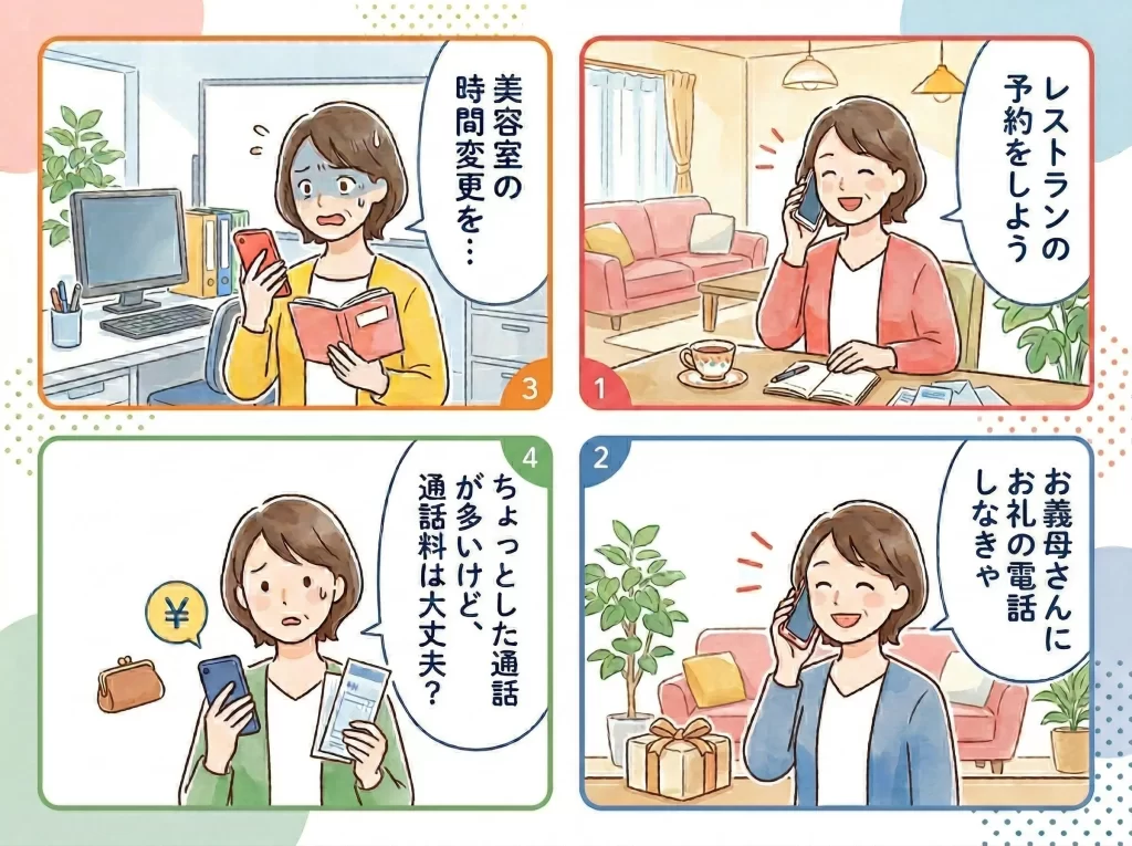 週に2〜3回、「お店の予約」「家族への連絡」「病院や役所への電話」など5分程度の通話があるなら、10分かけ放題の恩恵を十分に受けられるでしょう。