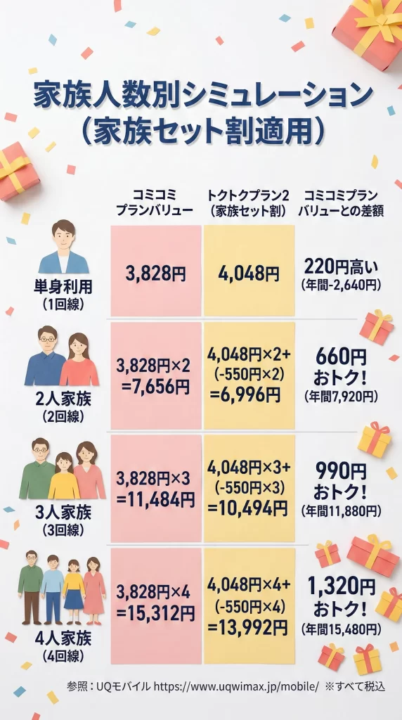 自宅セット割が使えない場合でも、家族にUQモバイル利用者がいれば家族セット割(-550円/月・税込)が使えます。