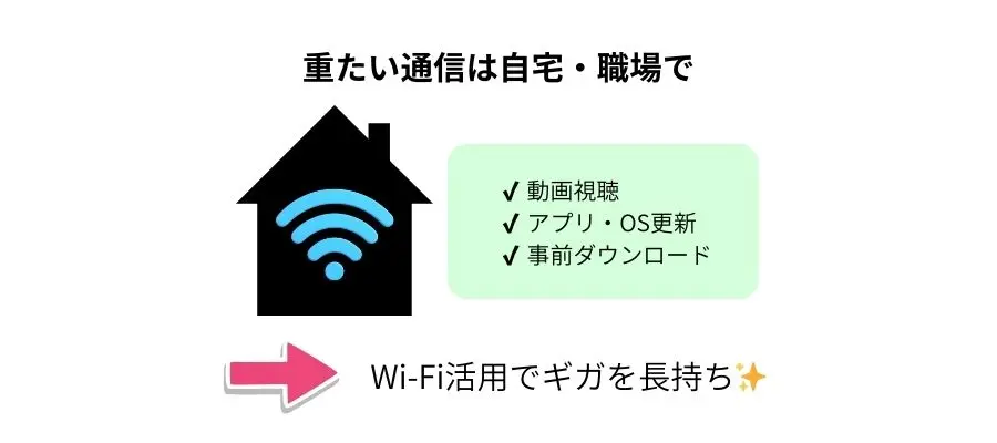 仕事で通信を多く使う方は、自宅の光回線やポケットWi-Fi、他社回線とのデュアルSIM運用を組み合わせると安心です。