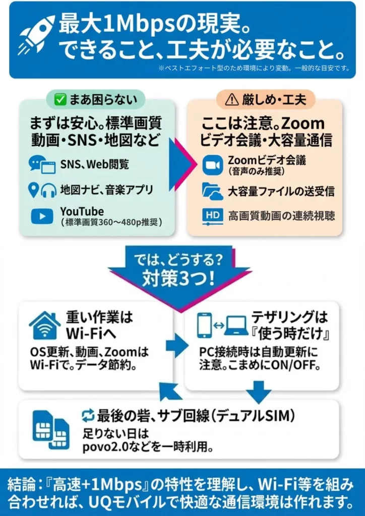 動画視聴やアプリ更新をWi-Fi中心にすれば、外出時は1Mbpsに落ちても困りにくく、UQモバイルの実質使い放題を活かしやすくなります。