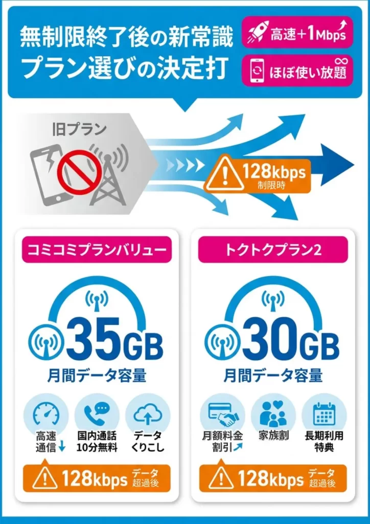 その代わりに、「コミコミプランバリュー」「トクトクプラン2」でデータ容量を使い切ったあとも最大1Mbpsで月末まで使い続けられる仕組みが用意されています。