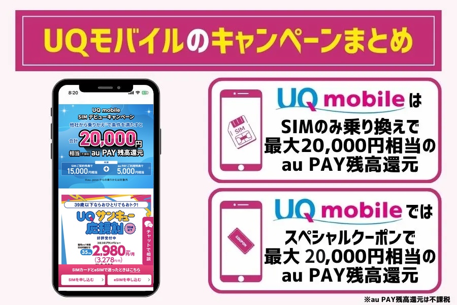 【結論】UQモバイルの最新キャンペーン情報まとめ!合計最大2.0万円(不課税)相当au PAY残高還元で乗り換え可能