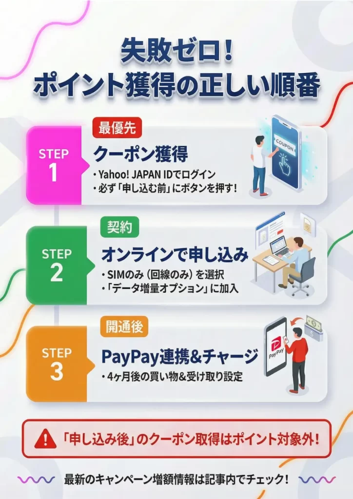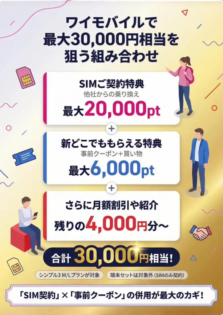「SIMご契約特典」と「新どこでももらえる特典」を正しく組み合わせるという条件を守れば、誰でもたどり着ける堅実な仕組みです。