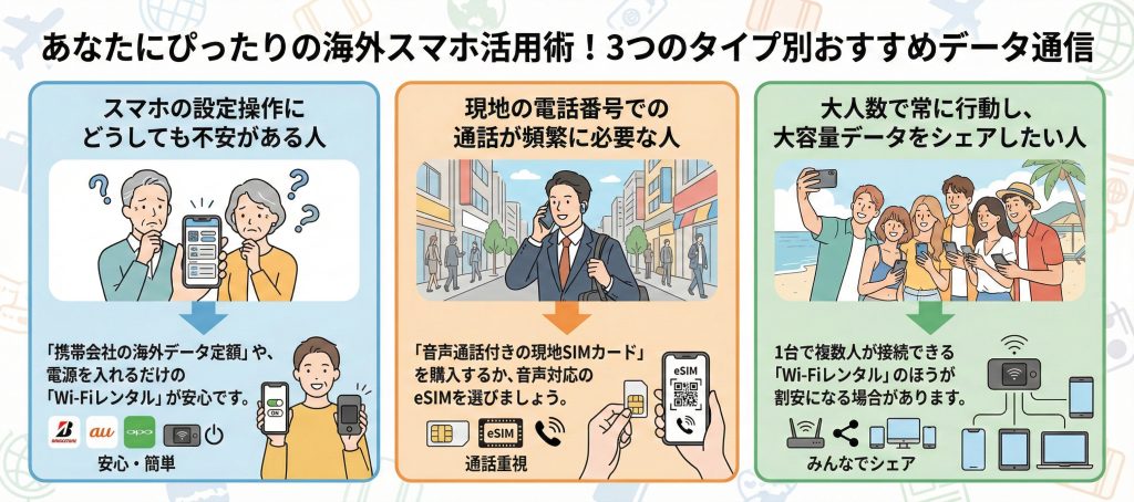 もし以下の条件に当てはまる場合は、eSIM以外の方法(Wi-Fiレンタル、携帯会社のローミング、現地の物理SIM)も検討してみてください。