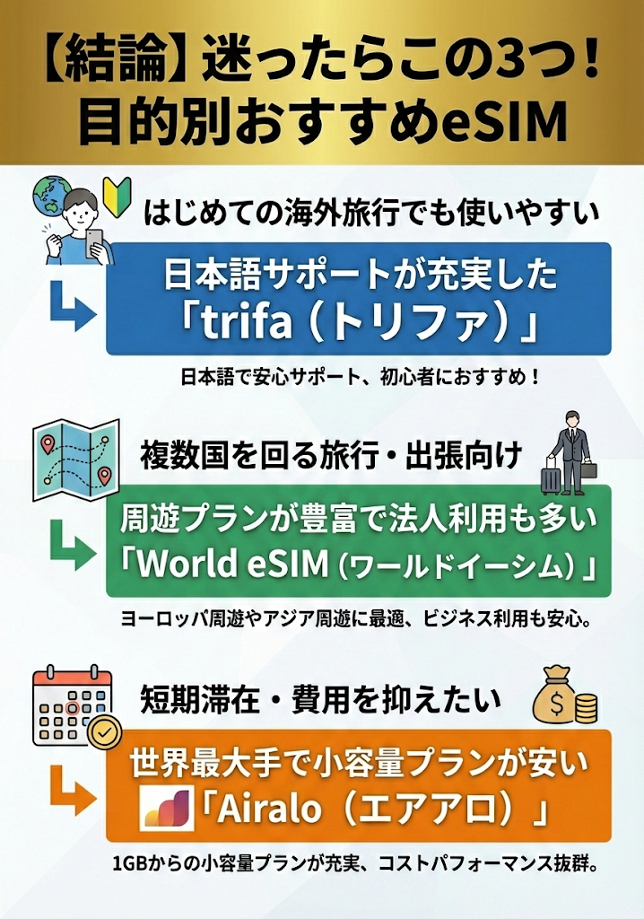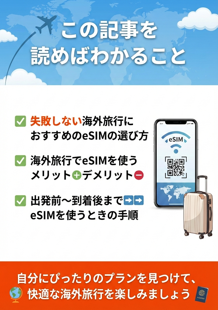 eSIM選びで失敗しないための以下のポイントも徹底解説しています。