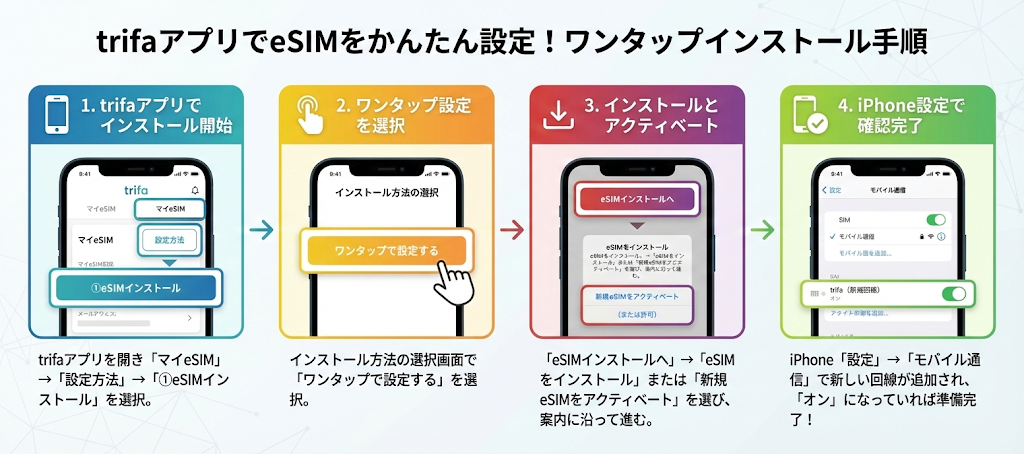 トリファの最大の魅力は、アプリから約3分で設定が完了する手軽さです。QRコードの読み取りが不要で、アプリ内で渡航先と期間を選んで購入すると、eSIMプロファイルが自動的にインストールされます。eSIMの設定に不安を感じている方でも、画面の案内に従うだけで完了するので安心です。