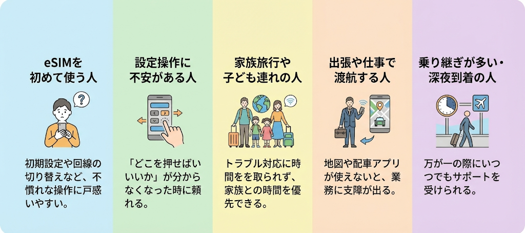 さらに、24時間365日の日本語サポート体制が整っている点も大きな強みです。現地で接続トラブルが起きた場合でも、アプリ内チャットから日本語ですぐに問い合わせができます。一人旅で夜間にトラブルが起きても対応してもらえるのは心強いポイントでしょう。