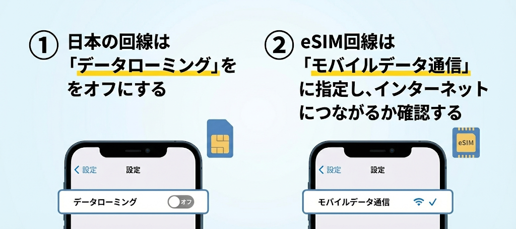 - 海外eSIMのデータローミングがオンになっているか、日本の回線のデータローミングがオフになっているかを確認する