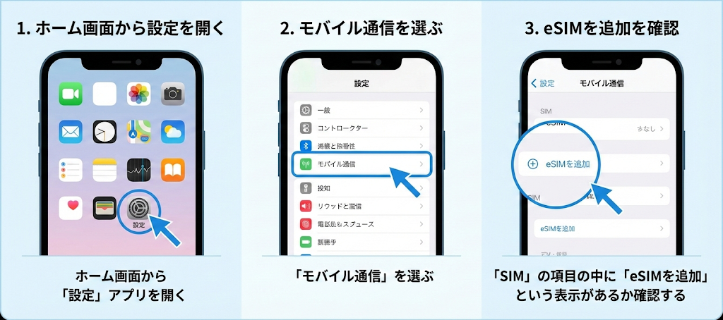スマホで「eSIMを追加」という項目を選ぶことができれば、eSIMを利用可能です。iPhoneでeSIMに対応しているかどうかを確認する手順は、以下を参考にしてみてください。