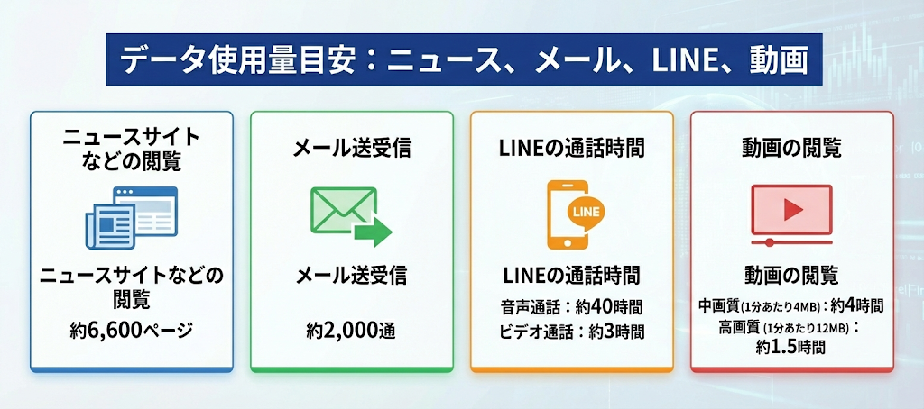 1日に必要な容量は地図アプリの閲覧やネット検索、LINEなどの連絡だけで済ませるのか、それとも動画などを観るのかによって大きく変わります。