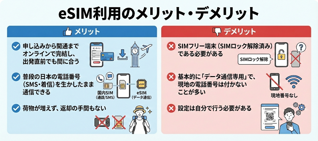 しかしすべての旅行者にとってeSIMが正解とは限りません。メリットとデメリット、そしてeSIM以外の方法を選んだほうが良いケースを、最後に振り返っておきましょう。