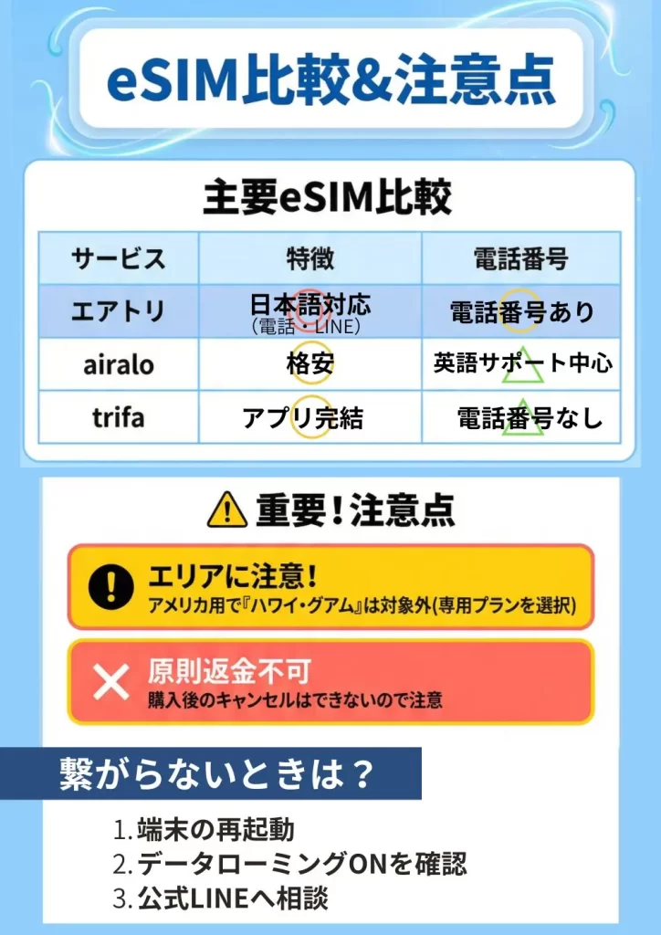 迷ったときは、現地でeSIMを有効化したうえで通信設定を見直し、それでも不安が残る場合はサポート案内を再度確認するようにしましょう。