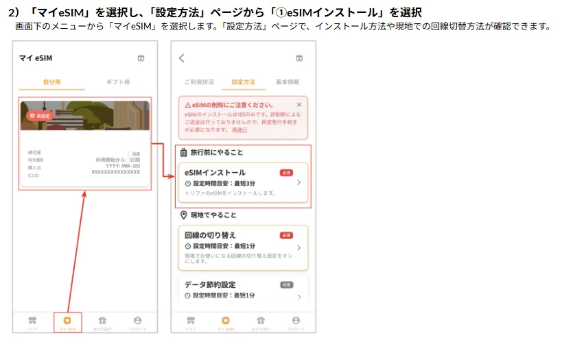 eSIMインストール方法がステップごとに画像付きで説明されていてわかりやすい!
