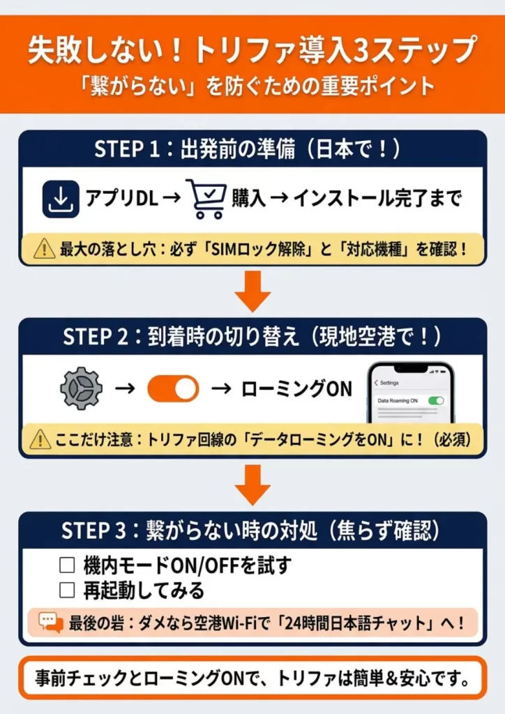 トリファのeSIMは、料金だけでなく端末との相性や設定の準備をしておくかどうかで、旅先の安心感がかなり変わります。
