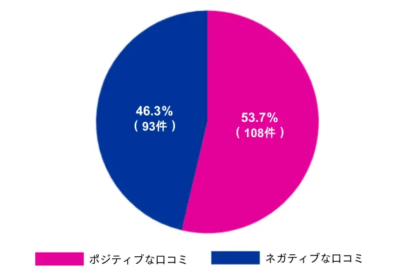 編集部でトリファeSIMの口コミ201件を集計したところ、ポジティブな口コミが53.7%(108件)、ネガティブな口コミが46.3%(93件)と、評価はほぼ半々に分かれました。