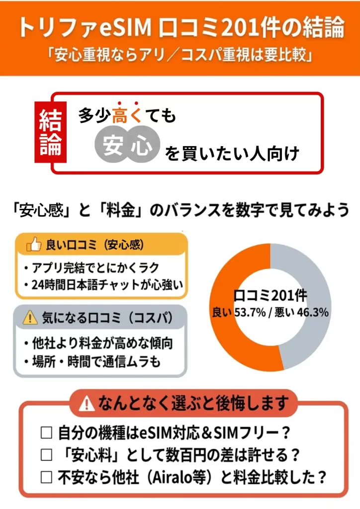 こうした口コミを総合すると、「多少価格が高めでも、不安な場面で日本語で相談できる安心を優先したい」という人ほど、トリファeSIMを好意的に受け止めていると考えられます。