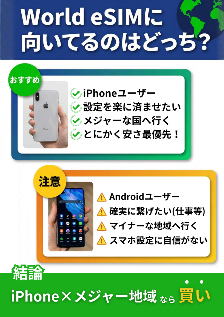 この記事を読むだけで、自分がWorld eSIMに向いているかがわかるはずです。