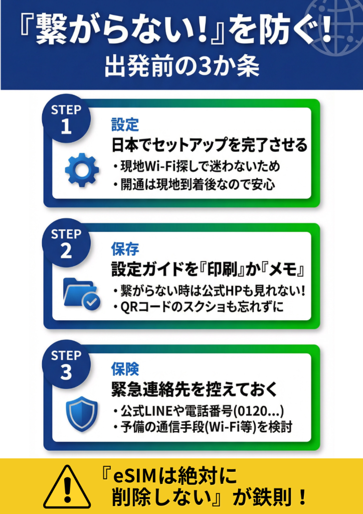 ※現地で家族や友人に接続してもらうように - 現地空港内のeSIM販売場所を抑えておく